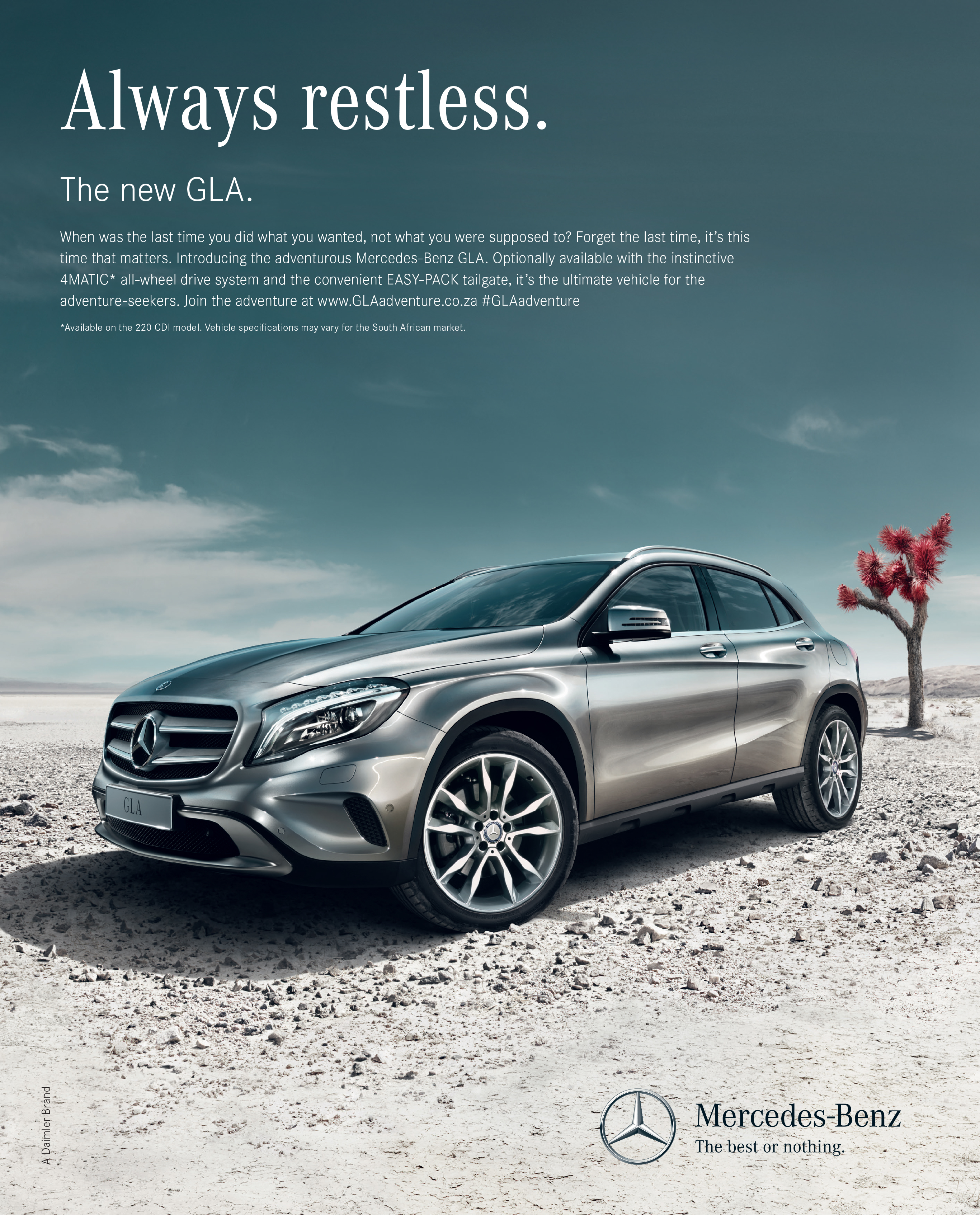 To fit in with the theme of “Always restless” we created an activation called the #GLA adventure, a series of 3 weekend adventures which took place nationwide. Each weekend was used to highlight the many features of the GLA as well as giving our young audience the chance to be part of an epic adventure alongside celebrities and trendy bloggers.By Creating a Great Customer Experience we generated Social Media content that got our dynamic and young target market talking (Facebook, Twitter, Youtube, Instagram and Pinterest). The Campaign was supported by TVC, Radio spots, print and outdoor.