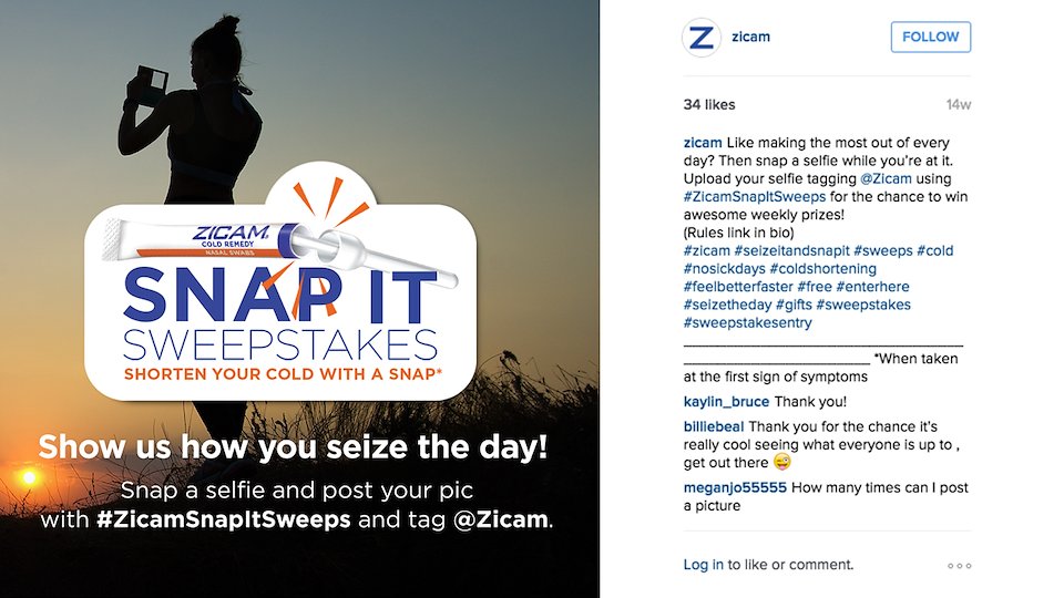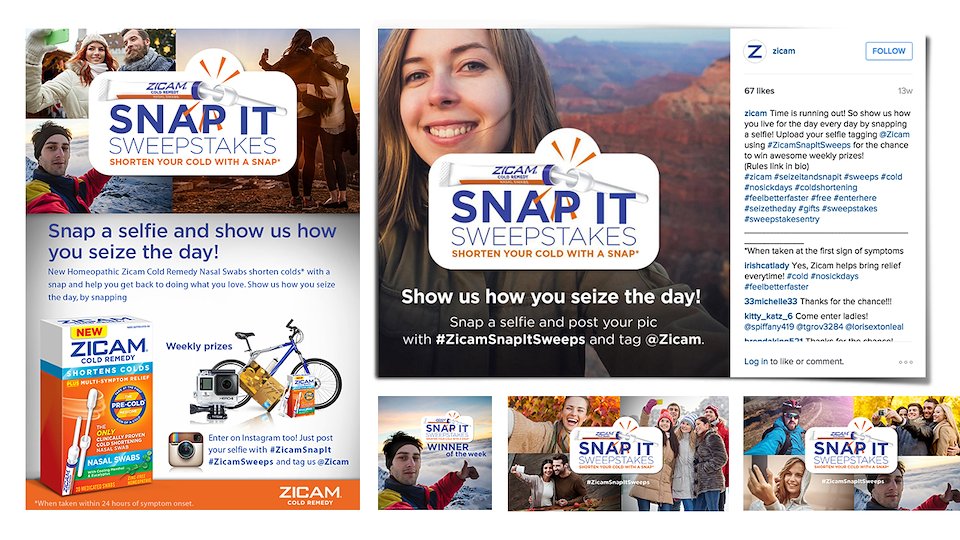 The Snap It Sweeps UGC Campaign was created to generate awareness about Zicam Remedy Nasal Swabs. The “Snap It” concept was a straight lift from the product usage ( the swab can be release by snapping the tube between your fingers ) So we asked our audience to Snap a Selfie and share it with @ZicamSnapitSweeps for a chance to win daily prizes. The campaign ran over a period of two months and generated a substantial amount of interest ,reaching 32.5K consumers and generating 8.9K photo entries on Instagram and Facebook.